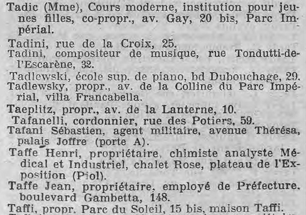 L’école de musique d’Albert Tadlewski se situait au 29. boulevard Dubouchage à Nice, actuellement à côté du Musée de la Photographie (théâtre de l’Artistique) et anciennement du temple Prostestant (église réformée de France). Tout porte à imaginer l’intime collaboration qu’il pouvait exister entre l’Ecole et le Théâtre.